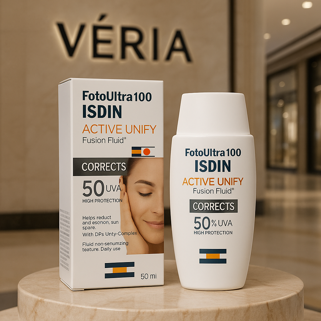 ISDIN FotoUltra 100 Active Unify Fusion Fluid SPF 50+. وظيفته: واقي شمس بتركيبة سائلة (Fusion Fluid) يوفر حماية عالية جدًا (SPF 50+) مع خاصية توحيد لون البشرة وتقليل البقع الداكنة، مناسب للبشرة المعرضة لفرط التصبغ.